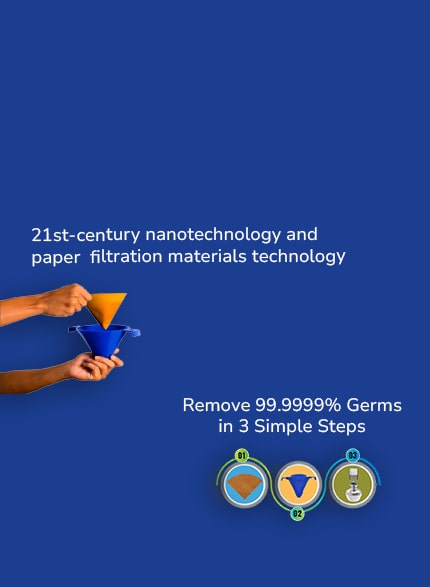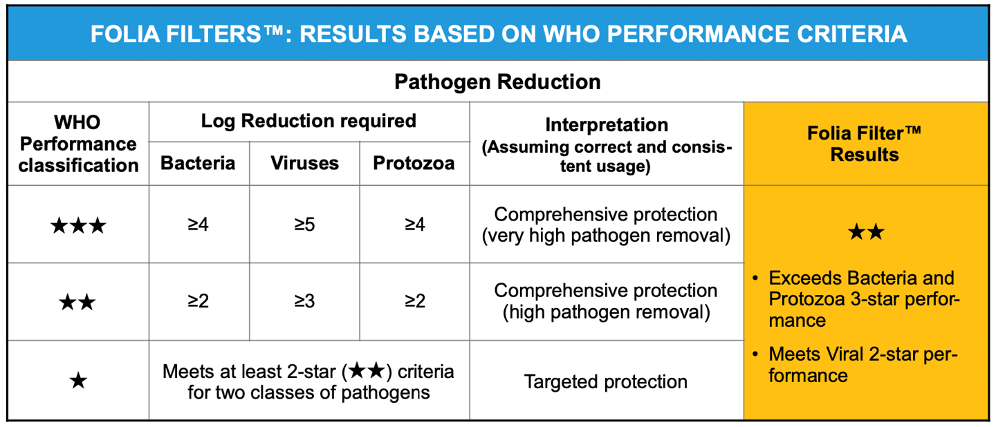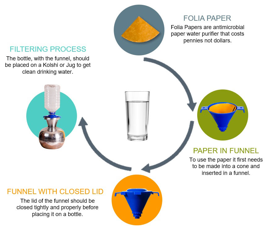 The Folia Water Filter is an antimicrobial filter paper that contains silver nanoparticles pore size physically filters out dirt and larger that kill bacteria and viruses, while the paper’s parasites